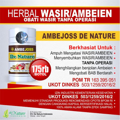 AMBEJOSS DE NATURE herbal untuk atasi wasir atau ambeien, herbal alami berkhasiat dalam bentuk kapsul yang berasal dari tanaman herbal seperti daun ungu, mahkota dewa dan kunyit putih, diberikan pada penderita jika penyakit masih dalam tingkatan stadium ringan.